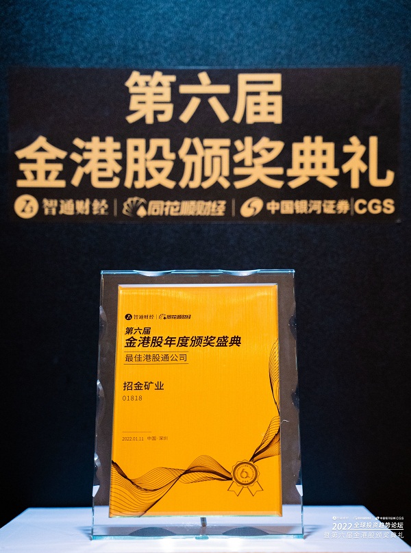 2022年1月11日,“2022全球投资趋势论坛暨第六届金港股年度颁奖盛典”在深圳隆重举行。招金矿业股份有限公司凭借稳健的发展态势以及在投资者中良好的口碑荣膺第六届金港股“最佳港股通公司”殊荣。